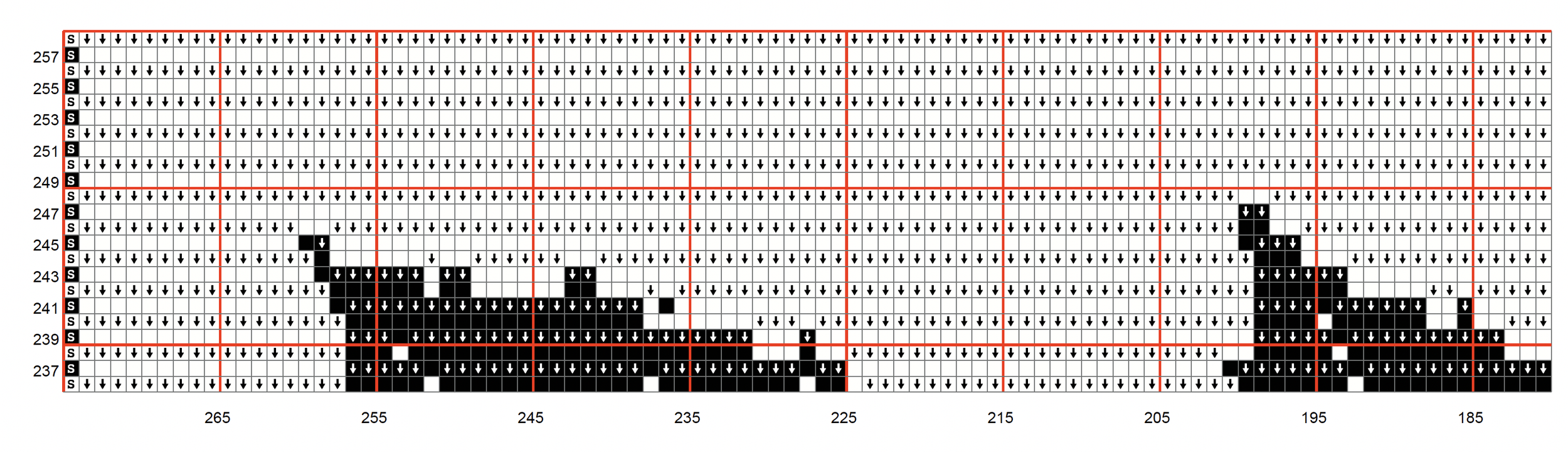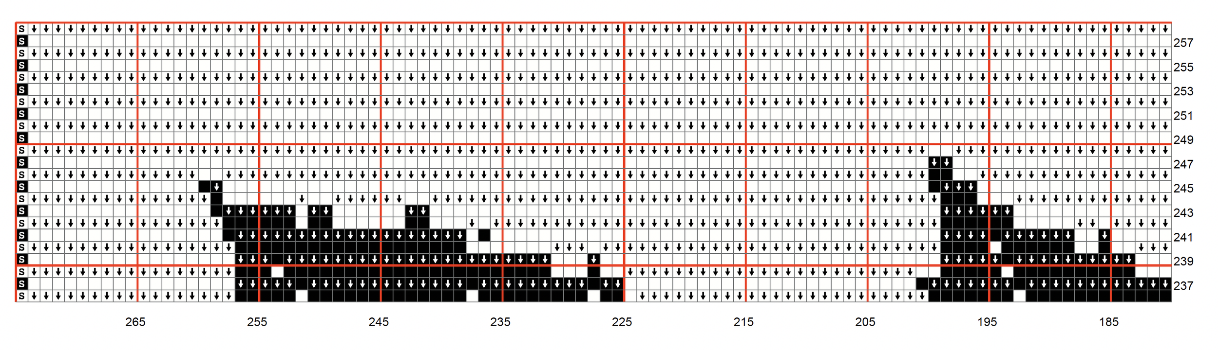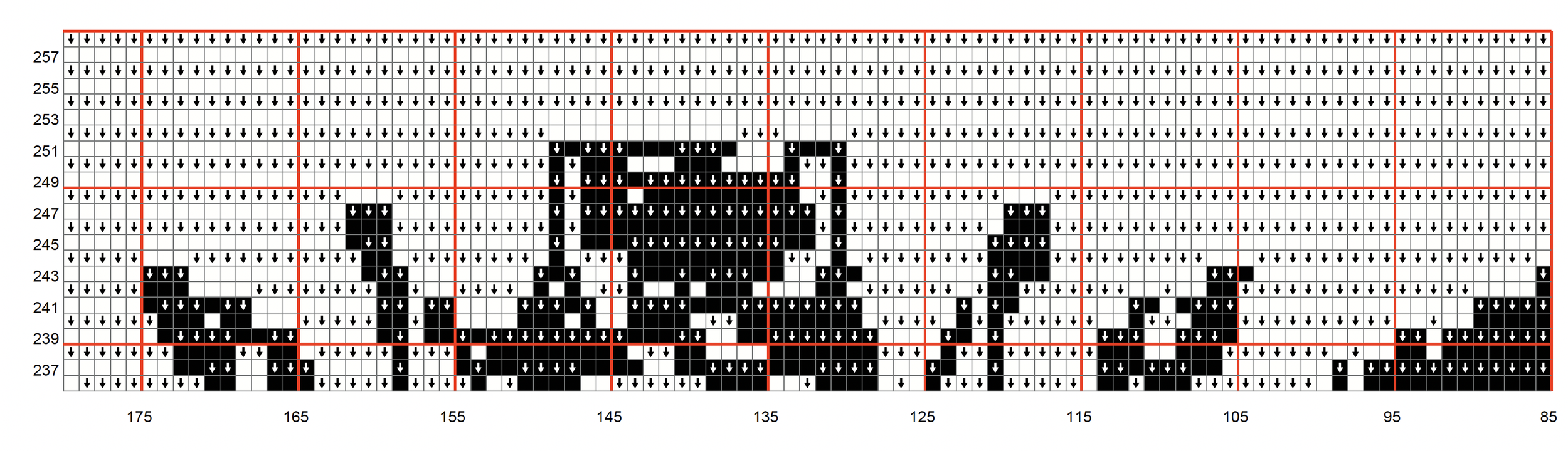 Row 64 (Black) SC x1, BLSC x62, FLDC x4, BLSC x7, FLDC x2, BLSC x17, FLDC x1, BLSC x1, FLDC x20, BLSC x14, FLDC x13, BLSC x14, FLDC x11, BLSC x1, FLDC x8, BLSC x1, FLDC x1, BLSC x18, FLDC x2, BLSC x7, FLDC x4, BLSC x65, SC x1