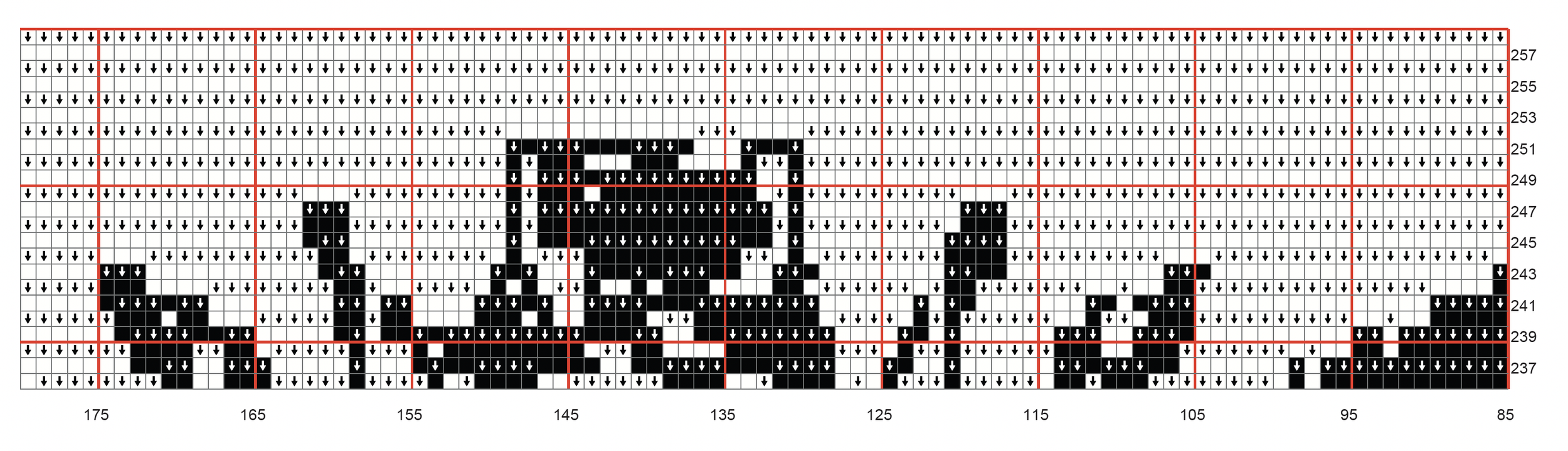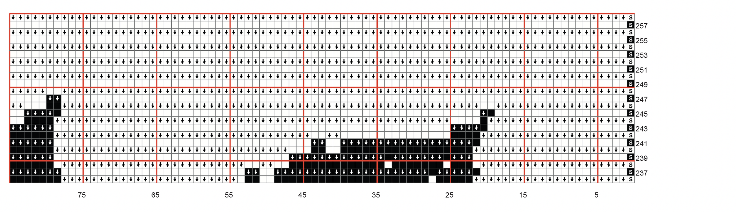 Row 75 (White) SC x1, FLDC x31, BLSC x5, FLDC x2, BLSC x4, FLDC x1, BLSC x27, FLDC x3, BLSC x5, FLDC x9, BLSC x29, FLDC x1, BLSC x1, FLDC x1, BLSC x3, FLDC x1, BLSC x1, FLDC x1, BLSC x1, FLDC x1, BLSC x1, FLDC x2, BLSC x1, FLDC x9, BLSC x1, FLDC x1, BLSC x4, FLDC x1, BLSC x1, FLDC x1, BLSC x1, FLDC x4, BLSC x28, FLDC x9, BLSC x5, FLDC x5, BLSC x25, FLDC x1, BLSC x5, FLDC x3, BLSC x3, FLDC x9, BLSC x4, FLDC x22, SC x1