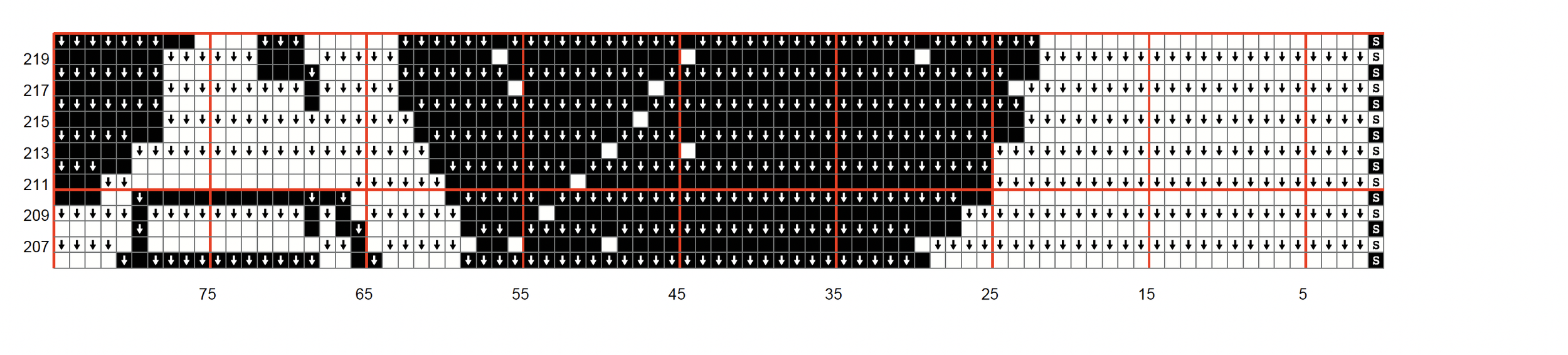 Row 219 (White) SC x1, FLDC x18, BLSC x33, FLDC x1, BLSC x7, FLDC x4, BLSC x5, FLDC x5, BLSC x29, FLDC x11, BLSC x5, FLDC x1, BLSC x12, FLDC x4, BLSC x21, FLDC x12, BLSC x13, FLDC x1, BLSC x14, FLDC x6, BLSC x4, FLDC x5, BLSC x41, FLDC x21, SC x1