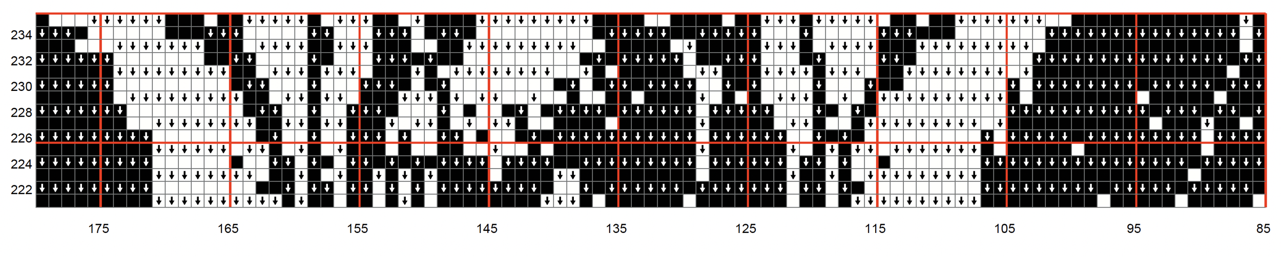 Row 228 (Black) SC x1, BLSC x17, FLDC x3, BLSC x1, FLDC x10, BLSC x2, FLDC x5, BLSC x1, FLDC x6, BLSC x1, FLDC x5, BLSC x3, FLDC x2, BLSC x16, FLDC x9, BLSC x1, FLDC x3, BLSC x1, FLDC x15, BLSC x10, FLDC x2, BLSC x2, FLDC x1, BLSC x2, FLDC x3, BLSC x4, FLDC x1, BLSC x5, FLDC x1, BLSC x2, FLDC x4, BLSC x1, FLDC x6, BLSC x1, FLDC x5, BLSC x3, FLDC x1, BLSC x2, FLDC x1, BLSC x11, FLDC x11, BLSC x1, FLDC x3, BLSC x1, FLDC x2, BLSC x1, FLDC x9, BLSC x17, FLDC x9, BLSC x1, FLDC x6, BLSC x1, FLDC x6, BLSC x2, FLDC x3, BLSC x2, FLDC x9, BLSC x20, SC x1