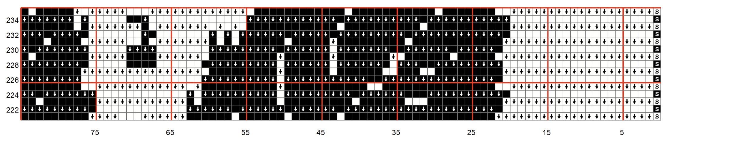 Row 75 (White) SC x1, FLDC x31, BLSC x5, FLDC x2, BLSC x4, FLDC x1, BLSC x27, FLDC x3, BLSC x5, FLDC x9, BLSC x29, FLDC x1, BLSC x1, FLDC x1, BLSC x3, FLDC x1, BLSC x1, FLDC x1, BLSC x1, FLDC x1, BLSC x1, FLDC x2, BLSC x1, FLDC x9, BLSC x1, FLDC x1, BLSC x4, FLDC x1, BLSC x1, FLDC x1, BLSC x1, FLDC x4, BLSC x28, FLDC x9, BLSC x5, FLDC x5, BLSC x25, FLDC x1, BLSC x5, FLDC x3, BLSC x3, FLDC x9, BLSC x4, FLDC x22, SC x1