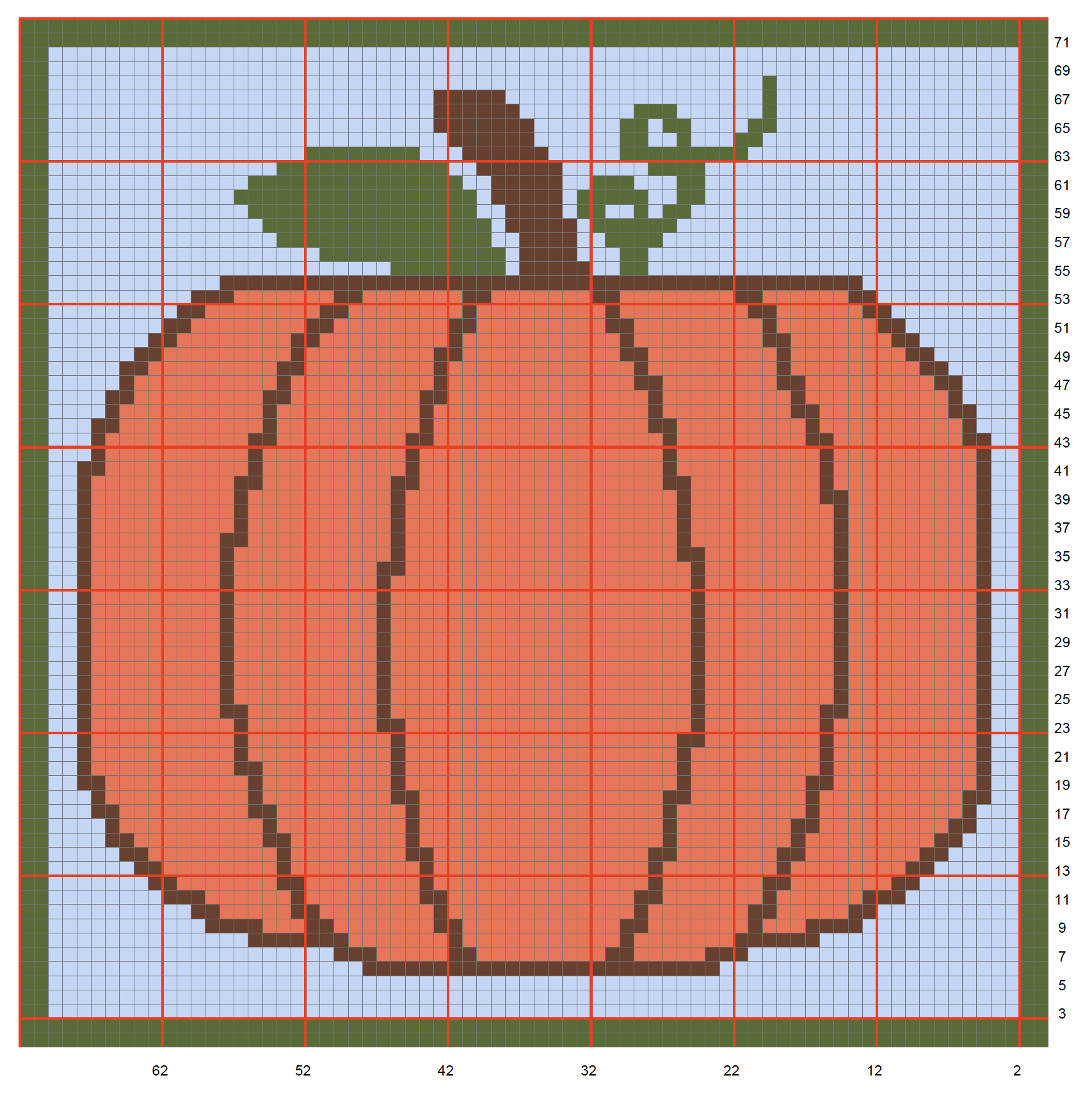 Row 52 (>>) Fern x2, Sky x9, Mahogany x2, Orange x8, Mahogany x2, Orange x8, Mahogany x1, Orange x9, Mahogany x1, Orange x9, Mahogany x2, Orange x6, Mahogany x2, Sky x9, Fern x2